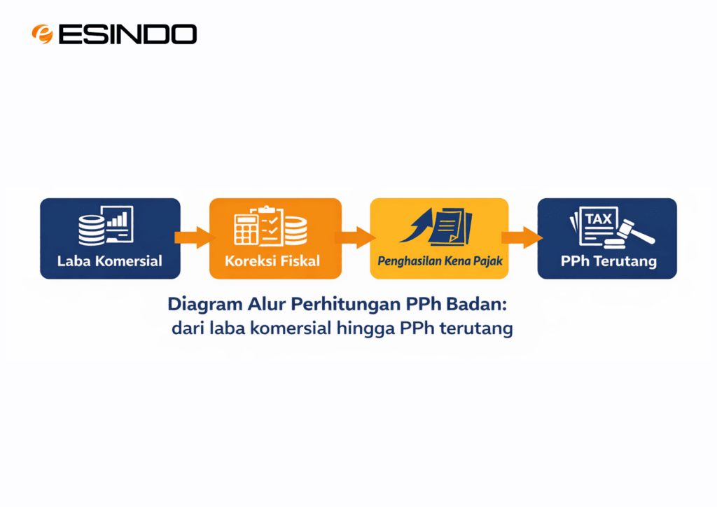Diagram Alur Perhitungan PPh Badan: dari laba komersial hingga PPh terutang