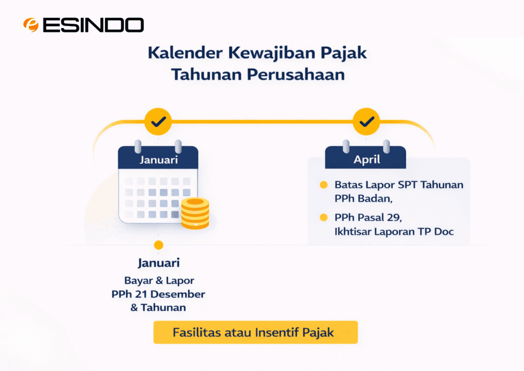 Timeline kewajiban pajak tahunan perusahaan yang menunjukkan deadline penting seperti pelaporan SPT Tahunan PPh Badan, pembayaran PPh Pasal 29, dan penyampaian dokumen TP Doc.