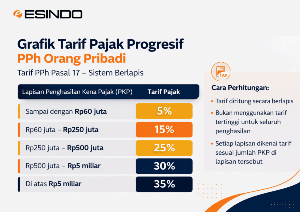 Indonesia menerapkan tarif PPh orang pribadi secara progresif, yang berarti tarif pajak meningkat seiring dengan bertambahnya jumlah Penghasilan Kena Pajak (PKP).